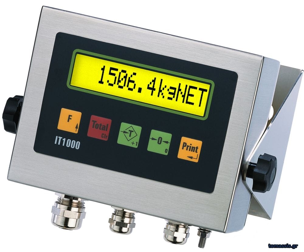 Ο ενδείκτης ΙΤ1000 είναι ένας απλός βιομηχανικών προδιαγραφών ένδειξης μόνο βάρους. Αποτελεί την πιο αξιόπιστη λύση ζυγιστικού τερματικού κατάλληλο για χρήση σε εταιρείες επεξεργασίας και εμπορίας σιδήρων, εταιρίες ανακύκλωσης, βιομηχανίες χημικών, τροφίμων, φαρμακοβιομηχανίες, λατομεία, κ.τ.λ.